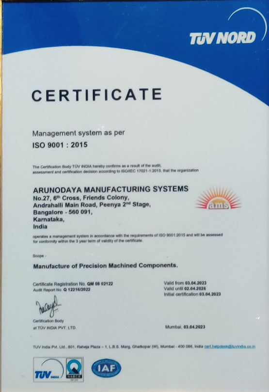 Arunodaya Manufacturing Systems is manufacture of Precision machined components for machine tool industries, Aerospace Application and Molding, Tools & Fixtures for other Industrial Applications. ISO 9001:2015 Certified Company. Arunodaya Manufacturing Systems is situated at the above cited address and we are having all the necessary infrastructural facilities to take up machining of components, we are equipped with well-qualified Staff and skilled workmen, who can execute the jobs as per Customer’s requirement.